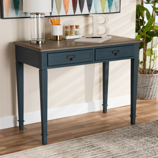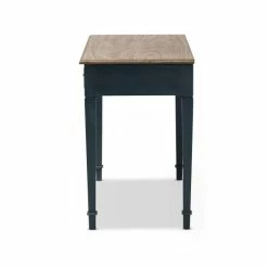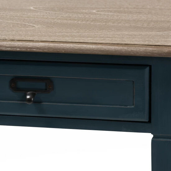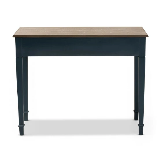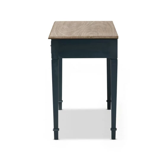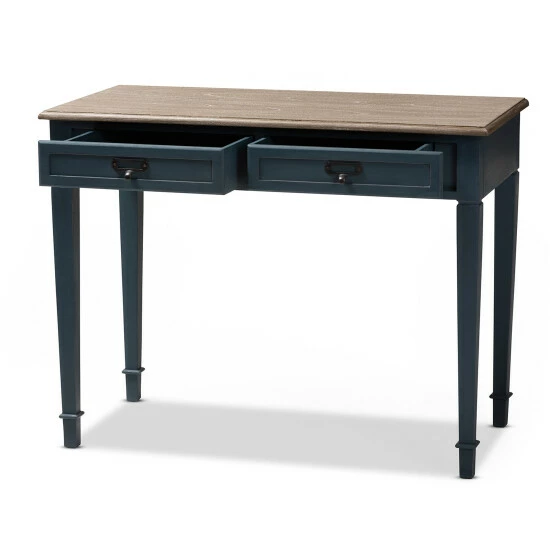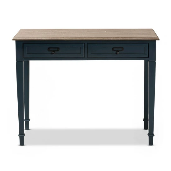 Boasting an elegant silhouette plus plenty of storage space, the Dauphine desk unifies fashion and functionality. Two drawers provide space to store pens, paper, and more. The tabletop is made of genuine mindi-wood and features a white-streaked natural veneer which complements the blue spruce finish on the desk drawers and legs.