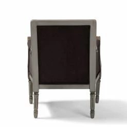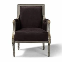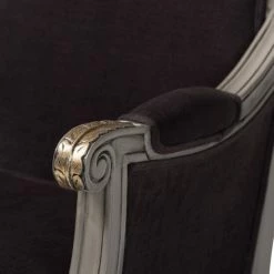 Constructed from solid mahogany wood, the Georgette displays a stunning grey finish enhanced with a dark patina for an aged look. The chair is upholstered in a soft velvet fabric comprised of an elegant brown hue interwoven with grey threads. Thick foam padding on the seat and armrests provide ample comfort.
