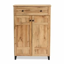 Featuring a classic design and ample storage space, the Glidden shoe cabinet offers a stylish method to keep your entryway organized. Made in Malaysia, this cabinet is constructed from sturdy wood accented with inset paneling. Two doors conceal five shelves with space to store approximately 15 pairs of shoes, depending on size. Requiring assembly, the Glidden features a large drawer for convenient storage of all your outdoor essentials. The doors showcase a recessed grid pattern for added visual texture, making the Glidden shoe cabinet a sleek addition to any space…