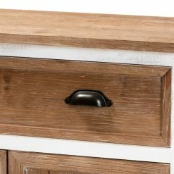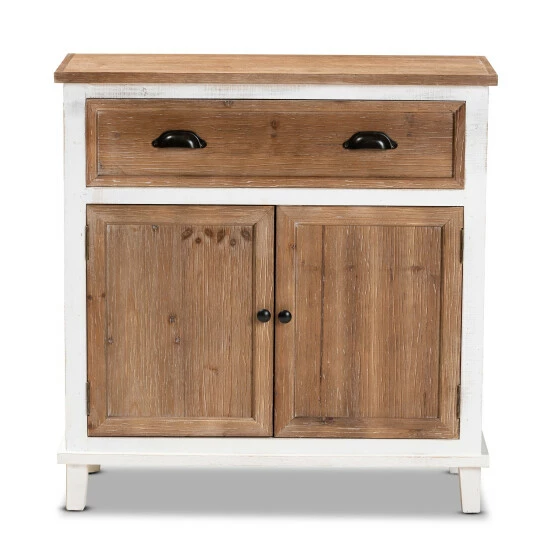 A natural color palette and convenient utility make the Glynn cabinet a fantastic addition to any kitchen or dining room. Made in China, the Glynn is comprised of a wood frame showcasing a lightly weathered two-tone white and oak brown finish for an aged look. One drawer and a compartment behind two doors provide ample storage space to help organize busy areas. Fully assembled, the Glynn is accented with black finished metal handles for a touch of modern charm. A handy piece that easily blends in with modern room layouts, the Glynn cabinet easily upgrades any space…