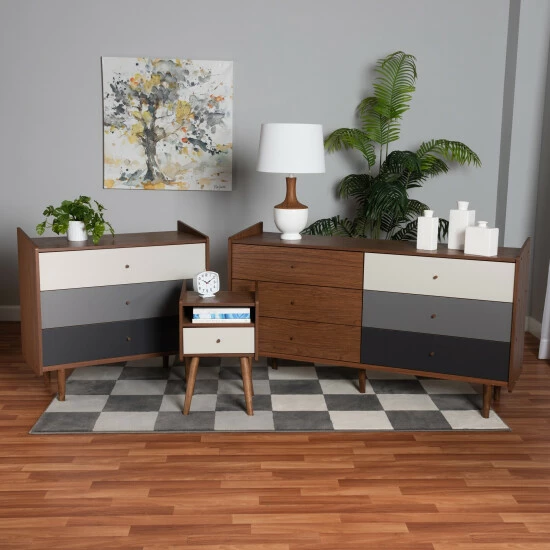 Embrace your creative side while organizing your space with the visually stunning Halden storage set. Made in Malaysia, this lovely collection includes one dresser, one chest, and one nightstand comprised of wood. In addition to superb storage capacity, each piece is adorned with round drawer knobs and raided side panels for an eye-catching display. The Halden requires assembly and utilizes angled, tapered legs for excellent stability and support. A charismatic solution to your storage needs, the Halden set elevates any bedroom.
