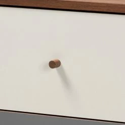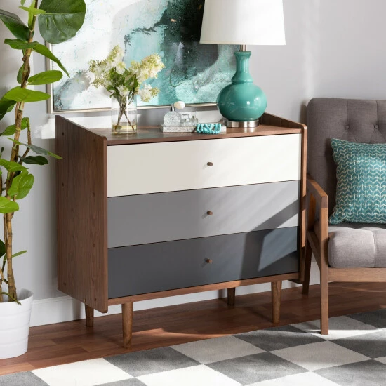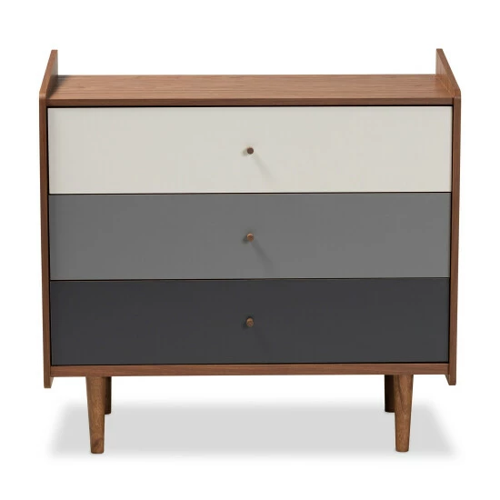 Add a creative highlight to your bedroom with the visually stunning Halden chest. Made in Malaysia, the Halden is comprised of sturdy wood showcasing a multi-color finish of walnut brown and a cool grey gradient. Three drawers provide ample storage for clothes and linens. Small, round drawer knobs add a minimalist touch. Requiring assembly, the Halden features angled sides and tapered legs for a chic, mid-century look. Brighten and elevate any bedroom with the striking style of the Halden chest..