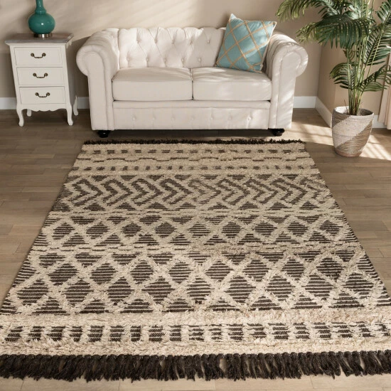 Bolster the interior of your home with the astonishing design of the Heino rug. Handwoven in India, this rug is comprised of wool. A stunning geometric design adorns the Heino with eye-catching visuals that complement modern interiors. The masterful blend of ivory and charcoal colored threads create rich texture, while fringe on the ends adds contemporary elegance. With its stunning, dynamic design, the Heino rug is sure to leave an impression. Ideal for smaller dining rooms and nooks, the Sanford dining nook set rejuvenates any space..