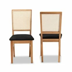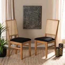 Blending rustic and modern design elements, the Idris dining chair adds a touch of warmth to your space. Made in China, this set includes two chairs crafted from sturdy wood. The seats are padded with plush layers of foam and upholstered in smooth fabric for exceptional comfort during any dining occasion. Requiring assembly, the Idris features a woven rattan backrest that lends a charming mid-century touch. A remarkable combination of style and comfort, the Idris dining chair adds personality to any space…