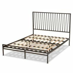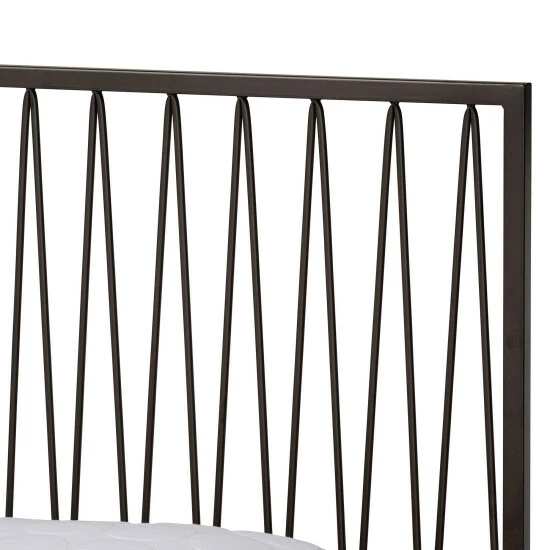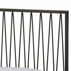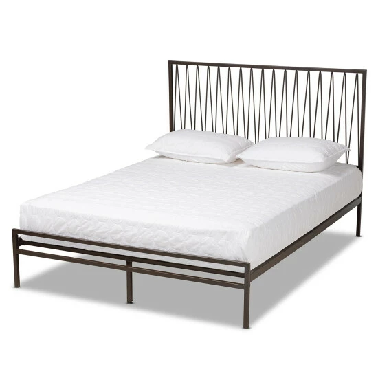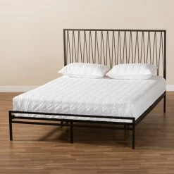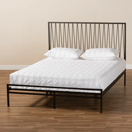 Clean lines and modern minimalism combine to form the Jeanette bed. Made in Malaysia, the Jeanette features a low platform frame comprised of sleek black finished metal. The headboard showcases a unique geometric design that adds visual interest to your space and allows light to flow more freely throughout the room. Requiring assembly, the bed is fitted with wooden slats for mattress support. A wonderful expression of modern design, the Jeanette platform bed is sure to update any bedroom…