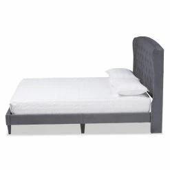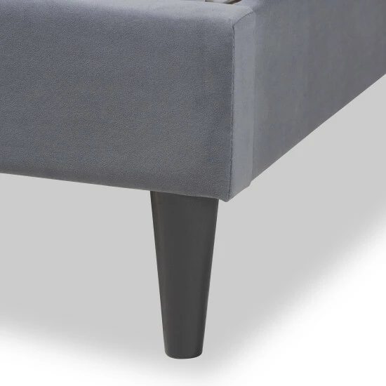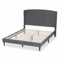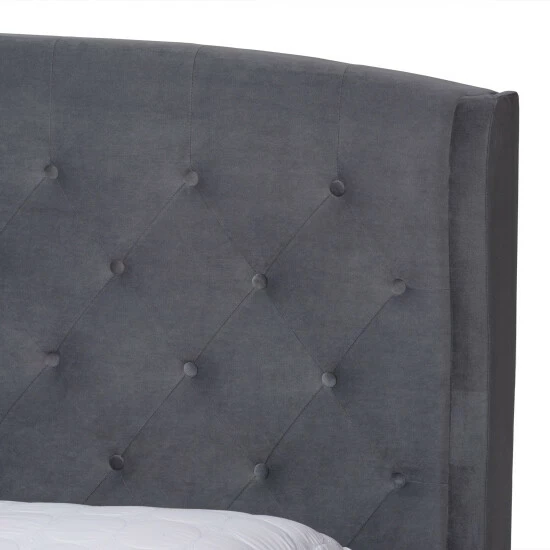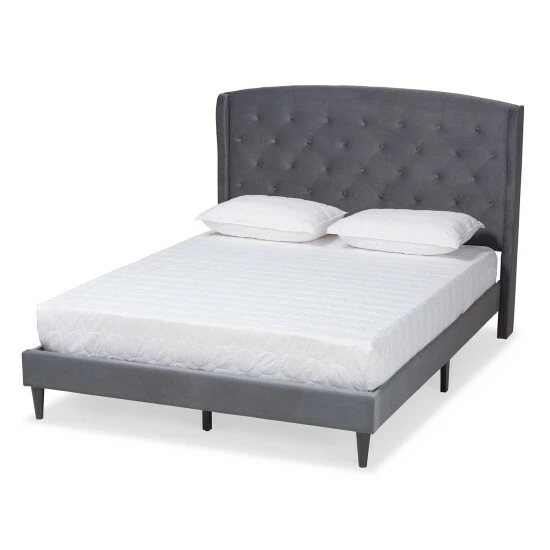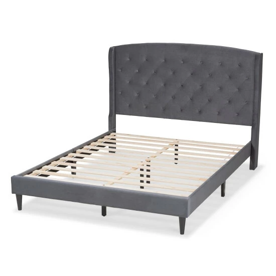 Rest and rejuvenate in the elegant prestige of the Joanna platform bed. Made in Malaysia, this lovely piece consists of a solid wood frame padded with foam and upholstered in sumptuous velvet fabric. The gentle curves of the wingback headboard lend a smooth silhouette while the button-tufted pattern forms an enchanting bedroom backdrop. The Joanna requires assembly and utilizes wood slats for mattress support, eliminating the need for a box spring. Tapered legs complete the look, making the Joanna platform a marvelous choice for the modern bedroom.