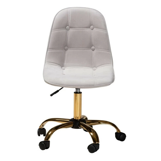 Uplift the style of your home office with the charming Kabira office chair. Made in China, this stunning piece consists of a solid metal base topped with an enticing velvet fabric upholstered seat. Button tufted accents exude graceful personality, while the rounded silhouette presents an inviting display. The Kabira requires assembly and features caster wheels for superb mobility. 360-degree swivel capability and adjustable height conveniently accommodate your needs, making the Kabira office chair a wonderful addition to any home office.