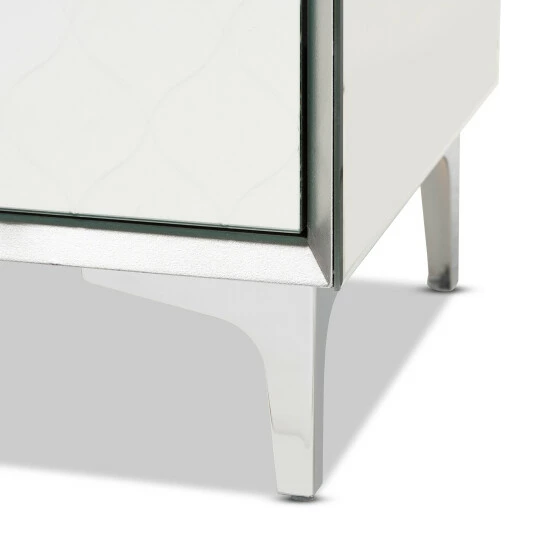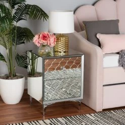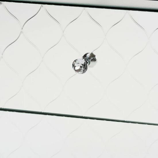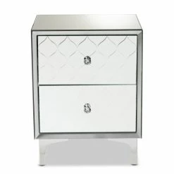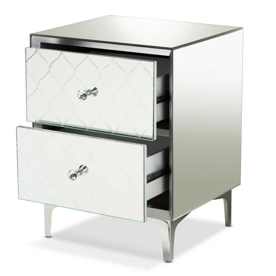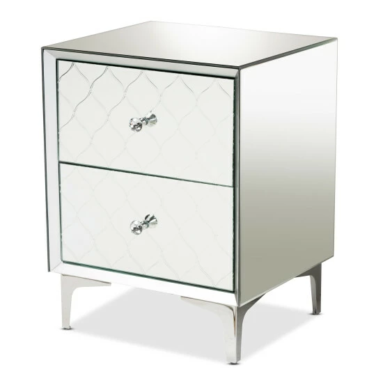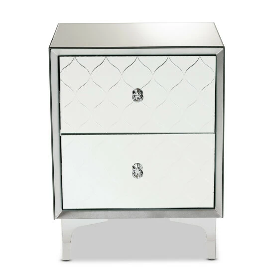 A truly dazzling solution to your bedside needs, the Kacela nightstand adds an opulent touch to your bedroom. Made in China, this stunning piece is comprised of a sturdy wood frame fitted with mirrored glass panels. Two drawers offer space to organize nighttime essentials, while crystal drawer knobs beautifully stand out with glossy allure. The Kacela will arrive fully assembled and features quatrefoil indentations for added geometric flair. An enchanting yet versatile addition, the Kacela nightstand upgrades any bedroom layout.