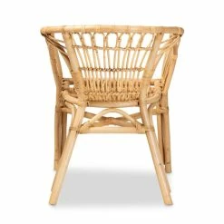 Boast an exotic ambiance during any occasion with the remarkable Kaka dining chair. Made in Indonesia, this chair is comprised of a natural rattan frame with bamboo-like embellishments. Its rounded backrest curves around to serve as sloping armrests while forming a smooth silhouette. The Kaka will arrive fully assembled and utilizes angled legs connected by a crisscross base for excellent stability and support. Perfect for granting a carefree mood, the Kaka dining chair transforms any dining experience.