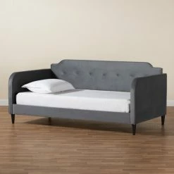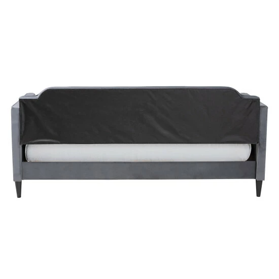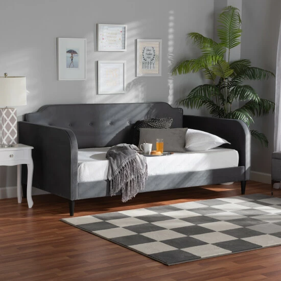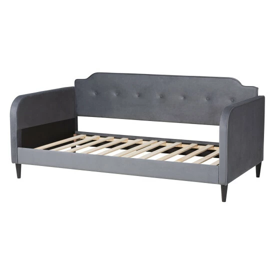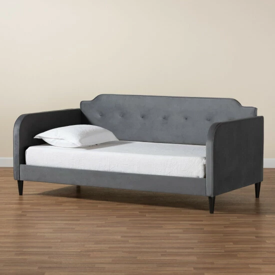 Take a break from routine to relax and rejuvenate in the remarkable Kaya daybed. Made in Malaysia, this stunning piece consists of a solid wood frame padded with foam and upholstered in lavish velvet fabric. Smooth curves and rounded angles lend a pleasant silhouette while button-tufted adornments exude contemporary elegance. The Kaya requires assembly and utilizes wood slats for mattress support, eliminating the need for a box spring. Tapered legs complement the streamlined design, making the Kaya daybed a refined addition to any bedroom layout.