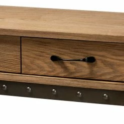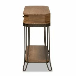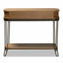 Add eye catching vintage charm to your home with the stunning Kellyn console table. Made in China, the Kellyn is constructed from black finished metal and oak brown finished wood for a unique, rustic look. Three drawers, fitted with black metal handles, provide valuable storage for keys, mail, and other items. Round studs add a cool industrial touch, while hairpin legs lend a light, airy appearance. Requiring assembly, the Kellyn is equipped with a lower shelf for displaying decorations. Organize your entryway or hallway with the aged aesthetic of the Kellyn console table..