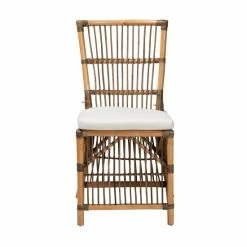 Dignified yet casual, the Kim dining chair bestows an air of tranquility to any dining occasion. Made in Indonesia, this bohemian-style piece consists of a handcrafted natural rattan frame fitted with a plush, fabric upholstered seat cushion. Its distinguished backrest gently curves for a cozy embrace while slim rattan rods adorn the piece for an airy display. The Kim will arrive fully assembled and features a flowing rattan skirt with angled legs for excellent stability and support. Exuding carefree elegance, the Kim dining chair adds a boho touch to any dining occasion.
