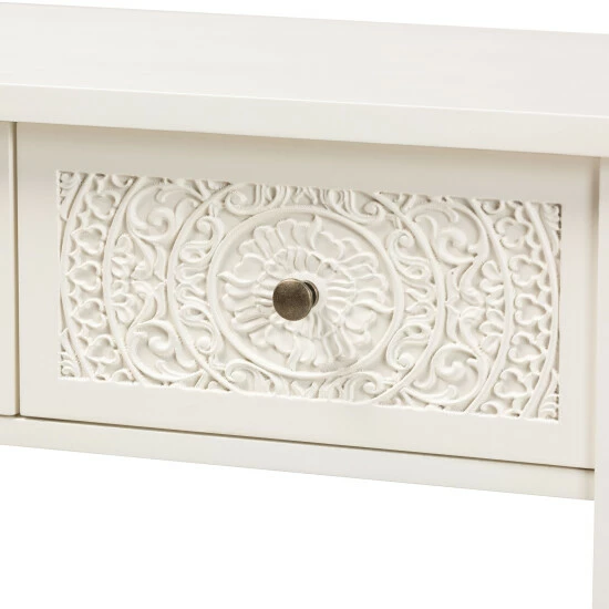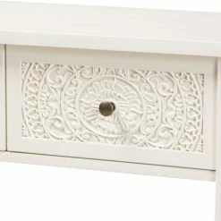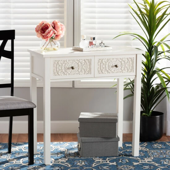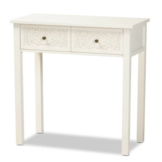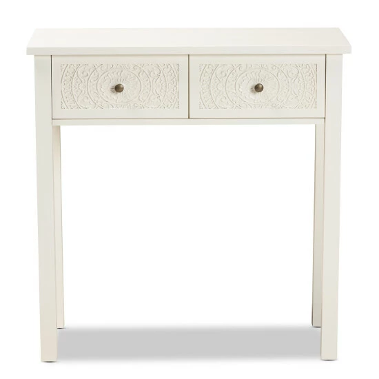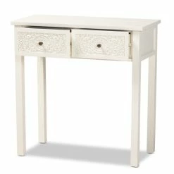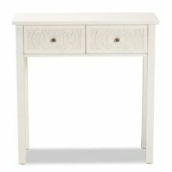 Embellish your home with the refined character of the Lambert console table. Made in China, this table is constructed from sturdy wood. Two drawers provide convenient storage for household essentials, while the open space between the legs can organize large items. Requiring assembly, the Lambert features intricately molded drawer faces for a unique visual texture that exudes antique-like charm. Small metal knobs add a minimalist touch, making the Lambert console table a sophisticated solution to your storage needs…