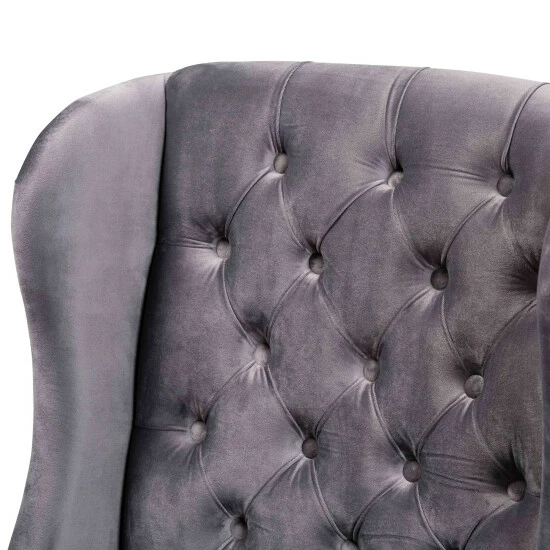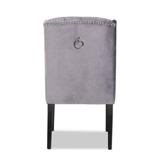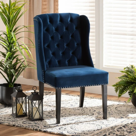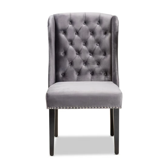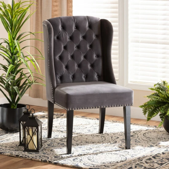 Outfit your dining room with the luxurious design of the Lamont dining chair. Made in China, the Lamont is comprised of a sturdy wood frame padded with soft foam and upholstered in sumptuous velvet fabric. Elaborate button tufting highlights the striking tones in the velvet and lends classic style. Requiring assembly, its traditional wingback silhouette is accentuated by a glamorous silver metal nailhead trim. A wonderful blend of eye-catching style and lavish comfort, the Lamont dining chair is a fantastic addition to any dining space…