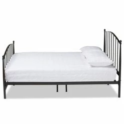 Add a modern touch to your bedroom with the smooth curves and light outline of the Lana bed. Made in Malaysia, this bed features a low platform comprised of black finished metal. The headboard and footboard showcase an openwork design that provides an airy feel, while smooth curves create a soothing silhouette. Requiring assembly, the Lana is equipped with wood slats for mattress support, eliminating the need for a box spring. Finial caps add an elegant touch, making the Lana bed a tranquil addition to any space. An ideal choice for smaller dining rooms and nooks, the Sanford dining bench rejuvenates any space..