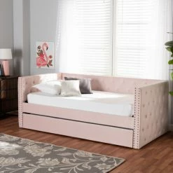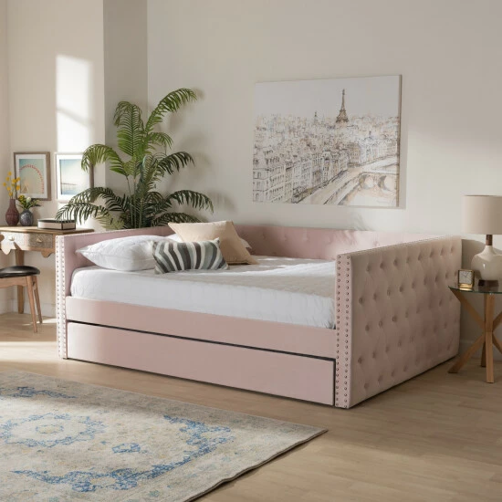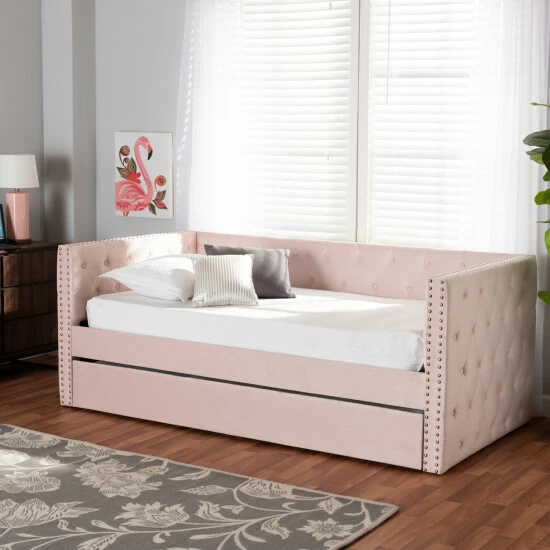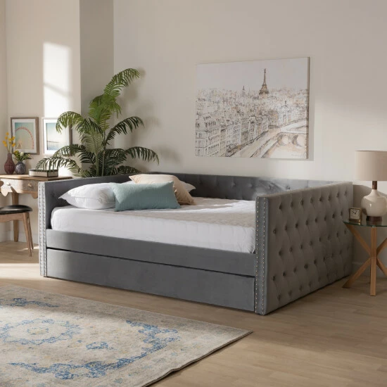 Imbue your bedroom with the calming character of the Larkin daybed. Made in Malaysia, the Larkin is comprised of a wood frame padded with foam and upholstered in rich velvet fabric. Silver finished metal nailheads and button tufting lend an elegant, contemporary look, while the roll-out trundle provides convenient accommodation for overnight guests. Requiring assembly, the Larkin utilizes wood slats for mattress support, which eliminate the need for a box spring. Clean lines create a sleek silhouette, making the Larking daybed a peaceful addition to the modern bedroom…