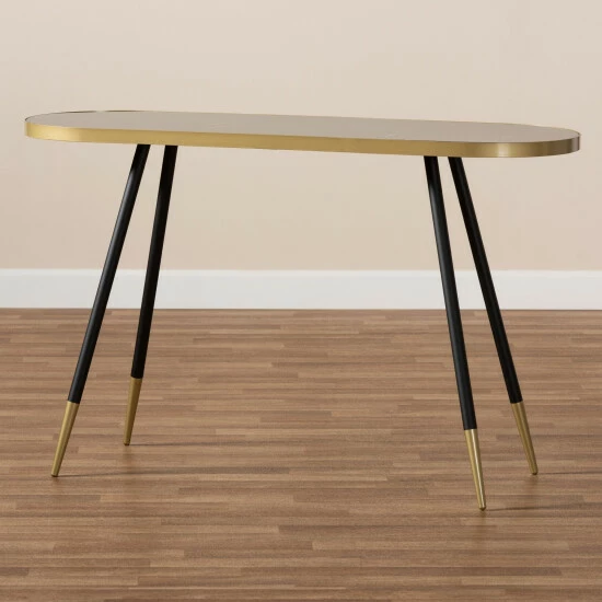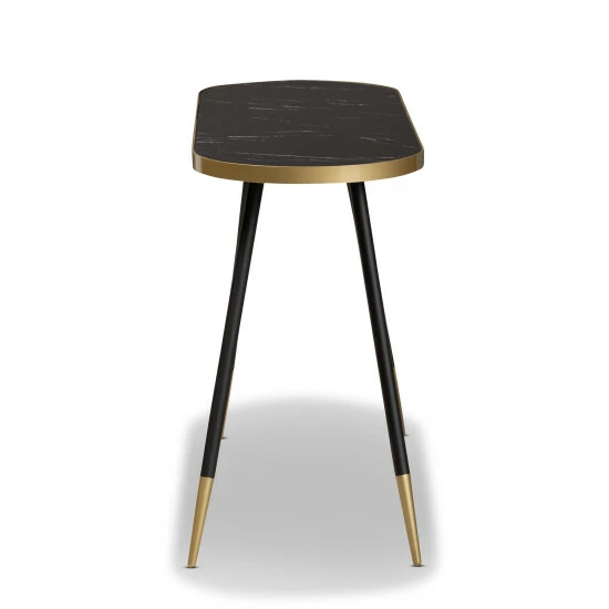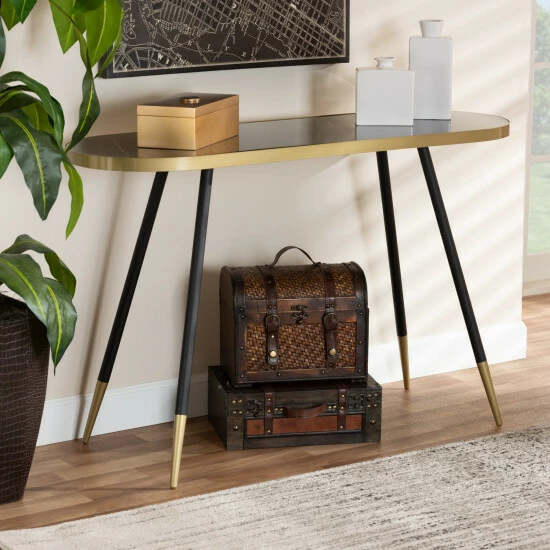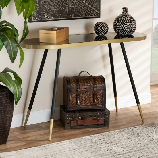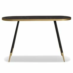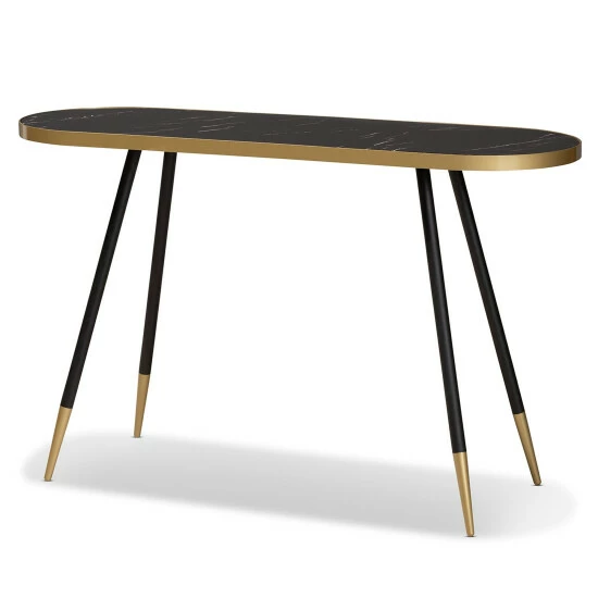 Bold curves elegantly adorned with gold-tone metal make the Lauro console table an eye-catching addition to any space. Made in China, the Lauro is fitted with a black faux marble tabletop large enough to gracefully display decorations. Black splayed legs ornamented with gold-tones offer ample storage space underneath the tabletop while also giving the piece a glamorous aesthetic. Requiring assembly, the slim frame makes the console well suited for tighter spaces. A chic, functional design makes the Lauro console table the ideal addition to an entryway or living room…