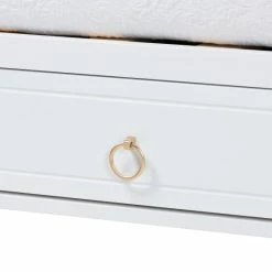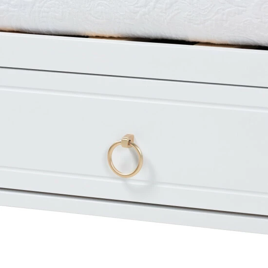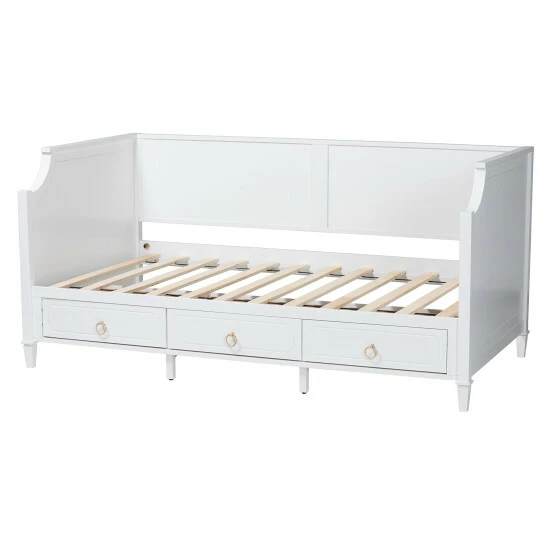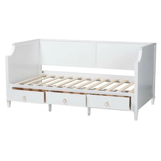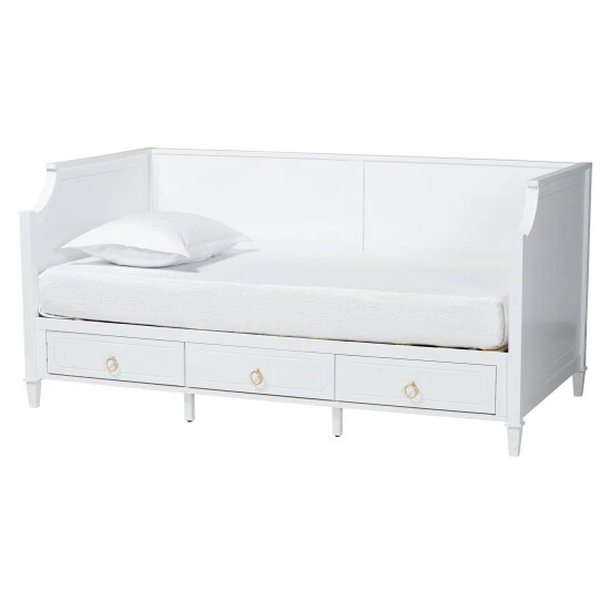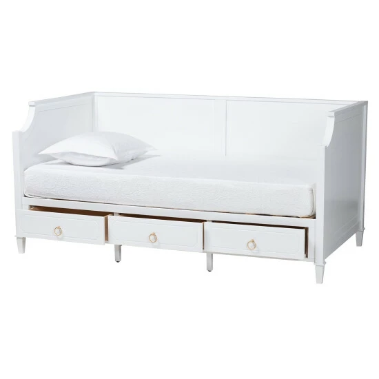 Casual lounging receives a graceful upgrade with the elegant poise of the Lowri daybed. Made in Malaysia, this lovely piece is crafted from sturdy wood. Three drawers adorned with exquisite ring-pull handles help organize your space for clean, tranquil oasis. The Lowri requires assembly and utilizes wood slats for mattress support, eliminating the need for a box spring. Scalloped corners and tapered legs combine to form a serene silhouette, making the Lowri daybed a breathtaking anchor in any bedroom environment.