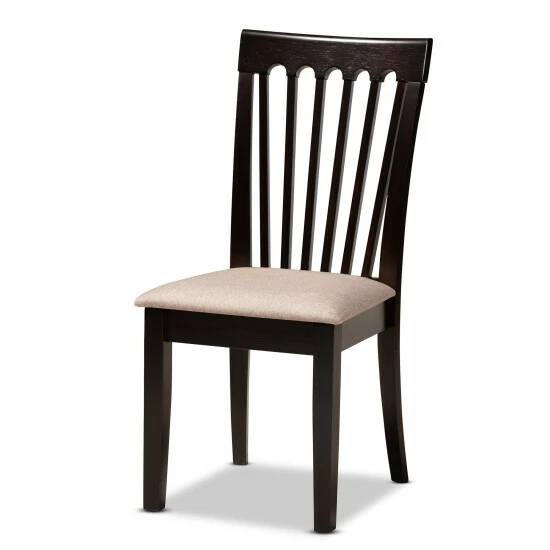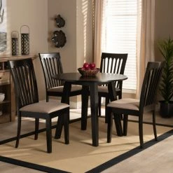 Timeless design is merged with modern comfort in the Maisie dining set. Made in Malaysia, this wooden set includes one table and four chairs, each upholstered in a light fabric that complements the dark brown wood finish. Designed with both comfort and style in mind, each chair features a plush foam-padded seat, as well as a striking cut-out design on its back. The round tabletop is supported by splayed legs, creating a stylish profile from any angle. Requiring assembly, the Maisie dining set elevates any dining experience…