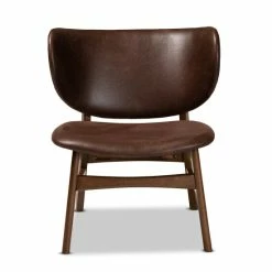 Add a mid-century touch to your interior with the expressive design of the Marcos accent chair. Made in Malaysia, this chair is constructed from walnut brown finished wood that exudes visual warmth. Its curved backrest and seat are padded with plush foam and upholstered in sleek faux leather effect fabric for superb comfort in any public or private space. Requiring assembly, the Marcos utilizes angled legs for stable support. With smooth curves and a visually stunning silhouette, the Marcos accent chair expertly blends style and comfort…
