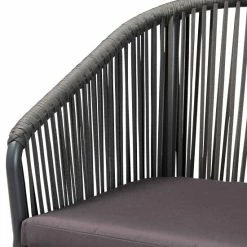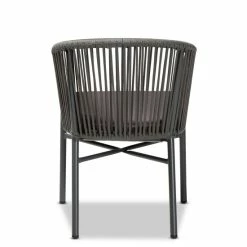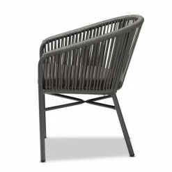 Enhance your patio or deck area in modern style with the Marcus dining chair. Made in China, the Marcus is comprised of a grey finished metal frame and weather resistant, grey texteline fabric seat. A plush, waterproof grey fabric cushion is tied onto the seat to bring lavish comfort outside of the house. The backrest features intricately woven rope for a cool, contemporary look that also enables light to flow through for a more open feel. Fully assembled, the Wendell is fitted with ergonomic armrests for added comfort. Reinvent your backyard with the unique style of the Marcus dining chair..