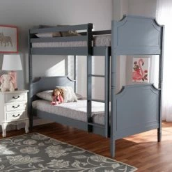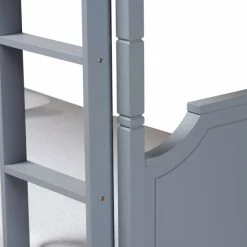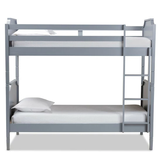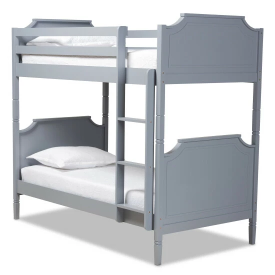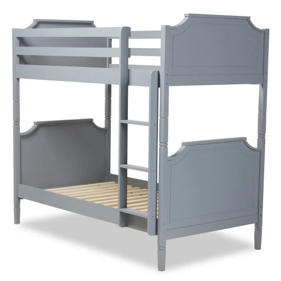 Host the best sleepovers with sleeping space for guests or save space by having your kids room together with this twin-size bunk bed. This classically designed bunk bed boasts sturdy pine wood construction to create a reliable, stable bed, and a smooth grey finish lends a neutral look that lasts through bedding changes and bedroom renovations. Crown molding adds a decorative finish, and cutout silhouettes draw the eye to the headboards and footboards. Your existing mattresses go onto these beds without a box spring due to the supportive slat system.