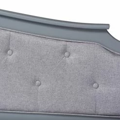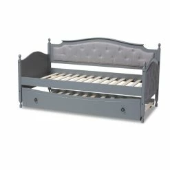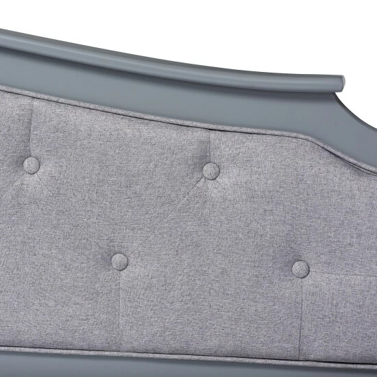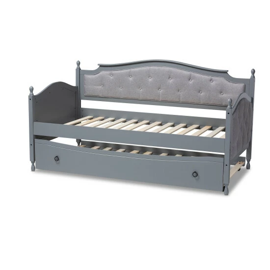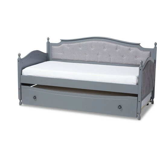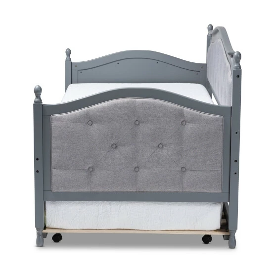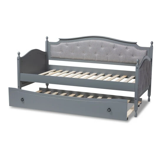 This versatile piece is fitted with a pull-out trundle to provide convenient accommodation for overnight guests. Its sturdy wood construction ensures durability, while its classic grey finish makes it easy to coordinate with any existing color palette. The daybed is built with elegant cut-out panels that are upholstered in a soft grey fabric and button tufted for a chic, refined look.