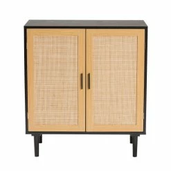 Embrace the rustic warmth of traditional craftsmanship with the lovely Maureen storage cabinet. Made in China, this bold addition is comprised of a solid wood frame adorned with woven rattan embellishments. Two spacious shelves behind the doors alleviate clutter with convenient storage for household essentials. The Maureen requires assembly and utilizes tapered legs for excellent stability and support in streamlined design. Minimalist drawer handles lend a contemporary touch, making the Maureen storage cabinet an outstanding addition to any bedroom.