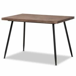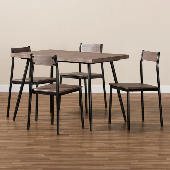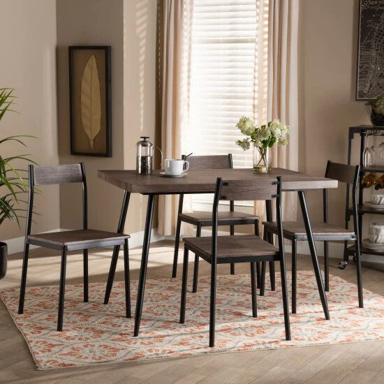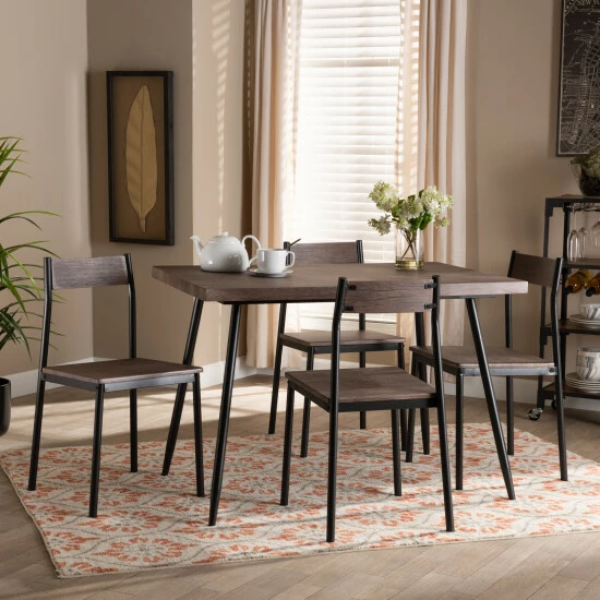With its contrasting textures and compact size, the Mave dining set embodies smart design. Made in China, this set includes one table and four dining chairs. Each piece is constructed from walnut finished wood and black metal, lending the set a chic, industrial look. Designed with both comfort in mind, each chair features a curved backrest. Splayed legs enable ample leg room and add a retro mid-century touch. Requiring assembly, the Mave dining set is the premium choice for smaller dining spaces and nooks..