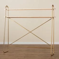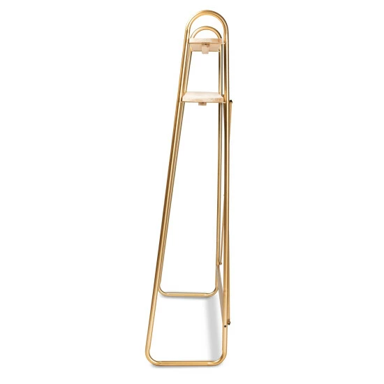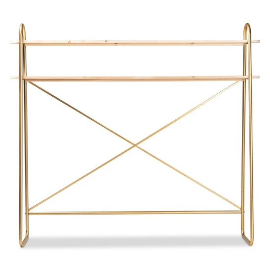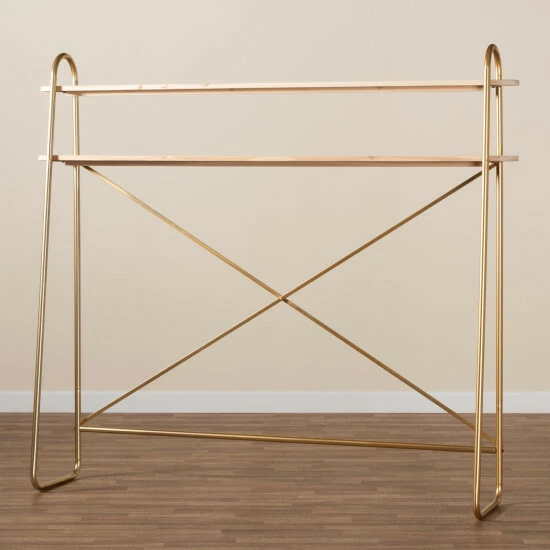 Add a dazzling and practical backdrop to your bedroom with the stunning Merida shelf. Made in China, the Merida is comprised of a brushed gold finished metal frame fitted with natural brown finished wood. Two shelves provide space to display decorations and provide convenient storage. Requiring assembly, the Merida features crisscross support bars for excellent stability, as well as a sleek, contemporary look. An alluring piece that transforms any bedroom, the Merida shelf is a superb addition to any space…