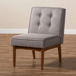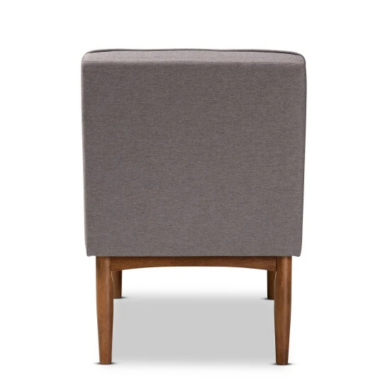 Enjoy weekend brunches and casual dinners with the Arvid dining chair. Constructed from wood in a walnut brown finish, the Arvid is upholstered in a soft, grey polyester fabric that is easy to coordinate with a wide range of color palettes. Inspired by stylish mid-century modern design, the chair showcases button tufting and tapered legs.