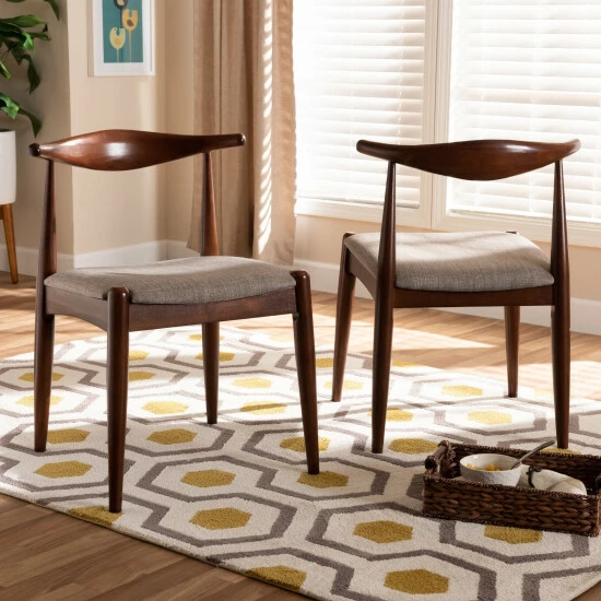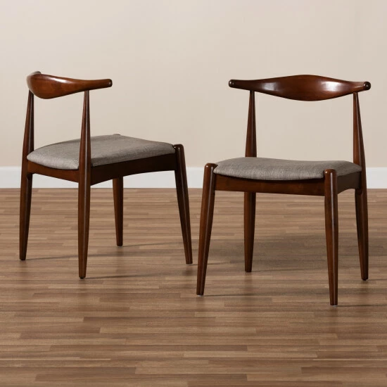 Give your dining space a stylish retro-inspired look with the Aeron dining chair. Constructed from sturdy rubberwood, the Aeron showcases a warm walnut brown finish. The seat is upholstered in a light grey polyester fabric and padded with foam for the utmost dining comfort.