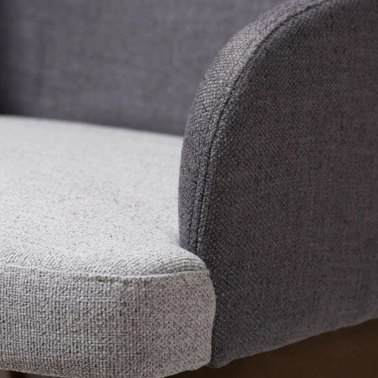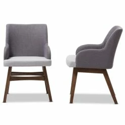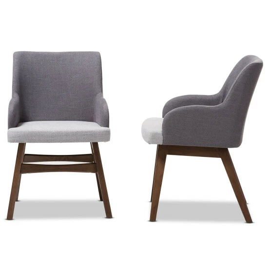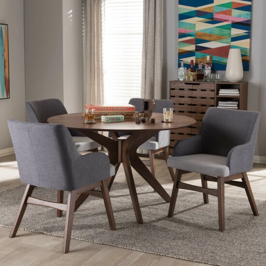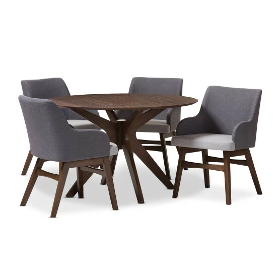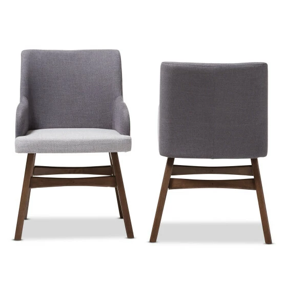Make dinnertime a sophisticated event with this posh and pretty dining set. Boasting a solid rubber wood frame for reliable durability, this table is sure to last for years to come. The chairs showcase grey upholstery with foam padding and raised armrests for a comfortable dining experience.