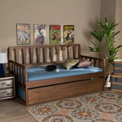 Midday naps and cozy reading marathons are made easy with the Midori daybed. Made in Malaysia, the Midori combines the functions of a sofa and bed into one. Its sturdy wood construction ensures durability, while its classic walnut brown finish adds warmth any space. Tapered, slatted panels give the Midori a cool, contemporary look and convey a light, airy feel. This versatile piece is also fitted with a roll-out trundle to provide convenient accommodation for overnight guests. Requiring assembly, the Midori daybed is the quintessential piece for a child’s room or guestroom..