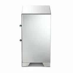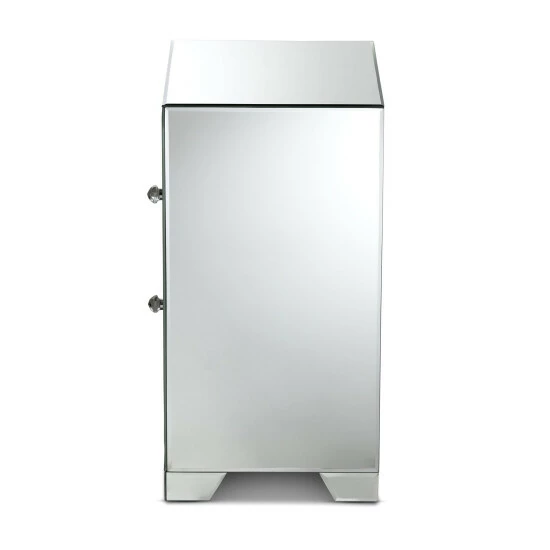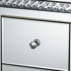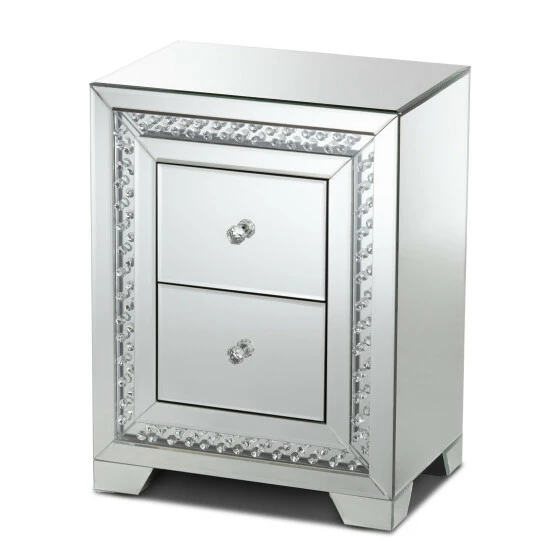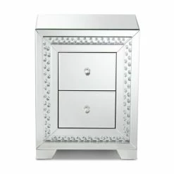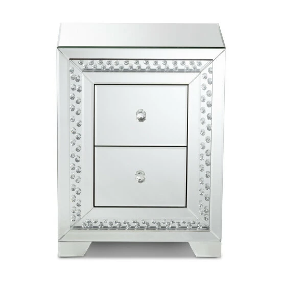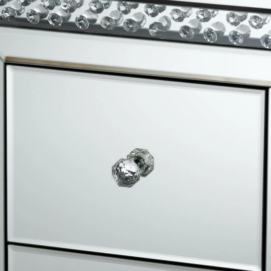 Add a touch of glamour to your interior with the Mina end table. The Mina is constructed from solid MDF wood and beveled mirrored glass. Three drawers provide ample space to store remotes, books, and other household essentials. The end table showcases two panels overlaid with crystal beads, which magnificently reflect the light within the room. Crystal drawer knobs add a decorative touch and provide easy access to the drawers. The Mina end table is made in China and will arrive fully assembled.