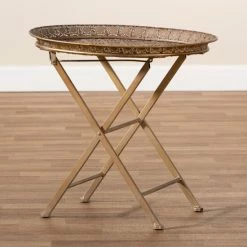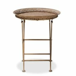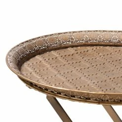 Inspired by the stunning artisan tables of Morocco, the Sabah tray table is a captivating addition to any interior. This metal table features a large, circular tray-style top embossed with a striking floral motif, ideal for serving tea or displaying decor. The tray is supported by a foldable base, providing a quick and easy storage solution when not in use.