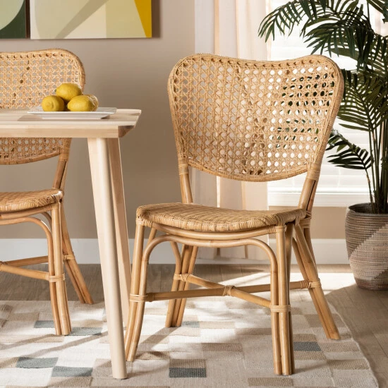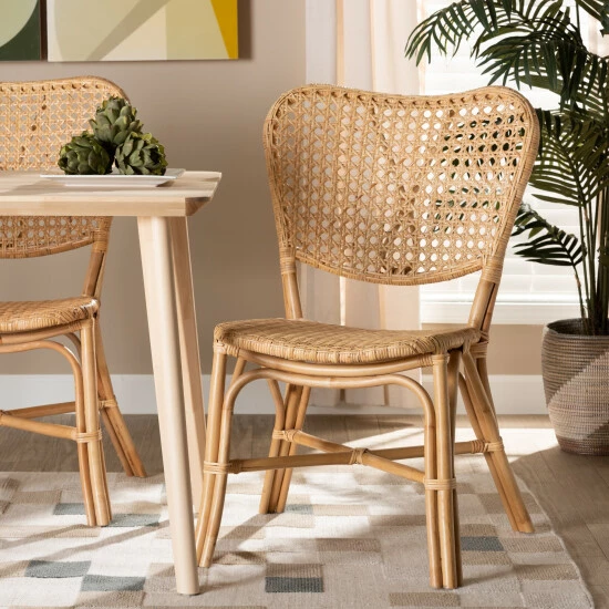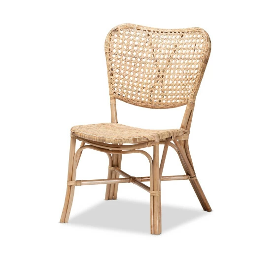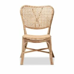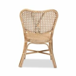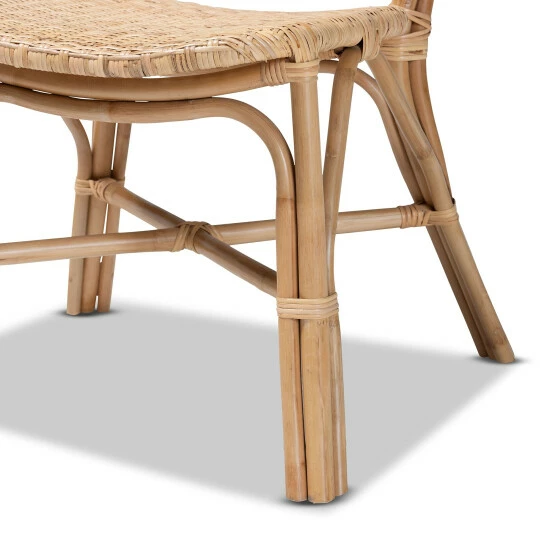 The Nadira dining chair presents welcoming, casual vibes to reframe the modern dining room. Made in Indonesia, this chair is comprised of a natural rattan frame featuring woven embellishments. Its bent seat and angled backrest offer soothing comfort for every meal. The Nadira will arrive fully assembled and utilizes angled legs for excellent stability and support in eye-catching design. Subtle yet exotic in its design, the Nadira dining chair is sure to leave a lasting impression. This is a product of nature and may have variations in areas such as, but not limited to, color, pattern, grain and texture. The hair-like strands of rattan/rattan-fiber are common due to nature of the material. .