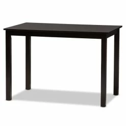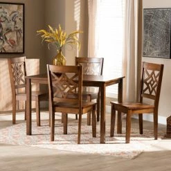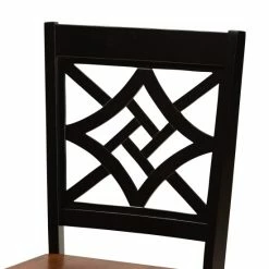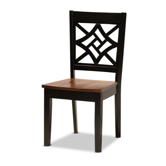 Add crisp, contemporary design to your dining space with the visually striking Nicolette dining set. Made in Malaysia, this wooden set includes four dining chairs and one dining table showcasing a distinctive two-tone dark brown and walnut brown finish. Each chair features a unique, geometric cut out design for added visual appeal, while a scoop seat lends casual comfort. Requiring assembly, the rectangular tabletop provides ample elbow room for each member of the table. Perfect for both casual and formal dining, the Nicolette dining set is an excellent addition to the modern home…