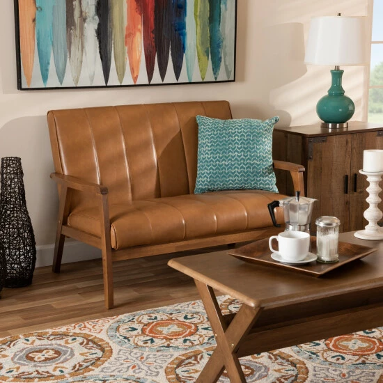 The Nikko loveseat is a stunning and eye-catching piece perfect for adding personality to any space. Made in Malaysia, the Nikko is constructed from sturdy wood padded with soft foam and upholstered in smooth, tan-colored faux leather. The angular frame showcases warm walnut tones and features long legs that form ergonomic armrests. Requiring assembly, sleek channel tufting provides unique visual charm while ensuring plush comfort that lasts. With a nod to mid-century design, the Nikko loveseat is an ideal accent piece for the modern home…