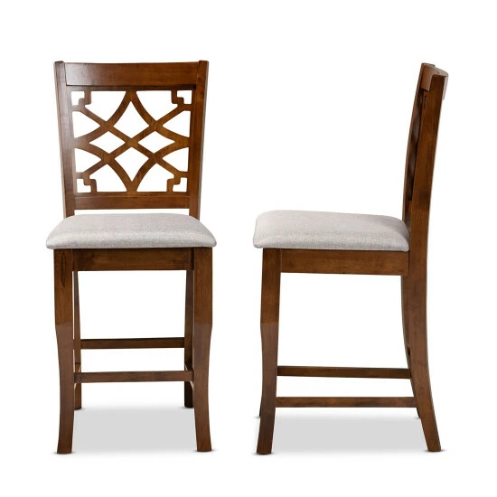 Featuring an exquisitely crafted frame, the Nisa counter stool adds elegance to any dining space. This solid wood chair displays a sleek walnut brown finish that complements the light fabric upholstery. Padded with foam for the utmost comfort as you enjoy long dinners, the Nisa features a striking cut-out back for enhanced visual appeal. Constructed at counter height, the stool is suitable for use with pub tables and kitchen counters. The Nisa counter stool is made in Malaysia and requires assembly…