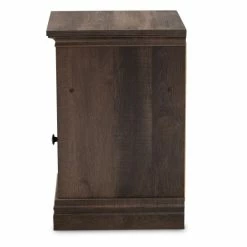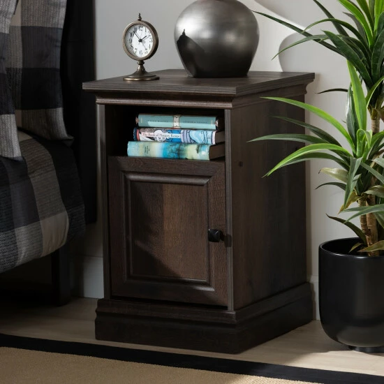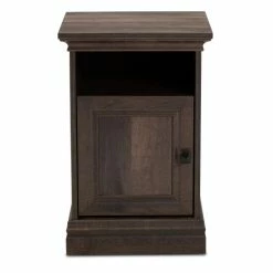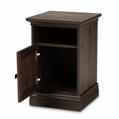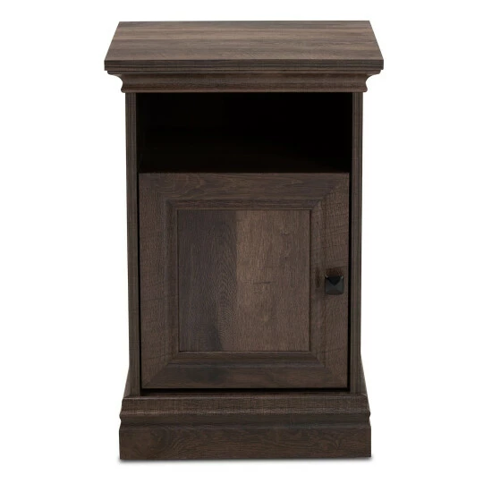 Complete your bedroom with this handsome nightstand from Baxton Studio. The Nolan nightstand features sturdy wood and particle board construction for long-lasting stability. The classic hazel walnut finish features contemporary paneling and a black square knob that adds a modern touch and coordinates beautifully with your decor. A spacious concealed compartment provides ample storage space for all your bedside essentials, while the single open shelf offers easy access to remotes and reading material. Simple assembly is required, and the stand is easy to spot clean.