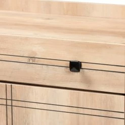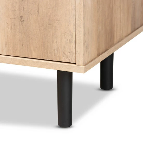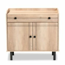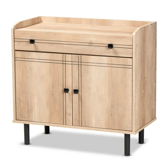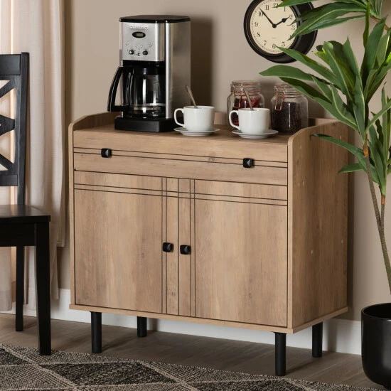 Outfit your kitchen with the superb utility and sleek style of the Patterson kitchen cabinet. Made in Malaysia, the Patterson is comprised of a sturdy wood frame showcasing a natural oak brown finish. One large drawer and two shelves behind the doors provide secure storage space for cookware and glassware. Requiring assembly, the Patterson features a rectangular tabletop with a protective barrier that can be used as a work space or as extra storage for larger items. Square black knobs and rounded black legs lend a contemporary look, making the Patterson kitchen cabinet an excellent upgrade to any space…