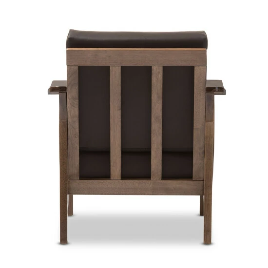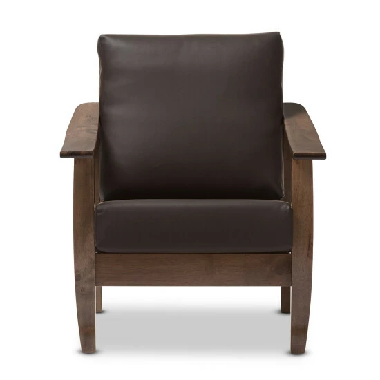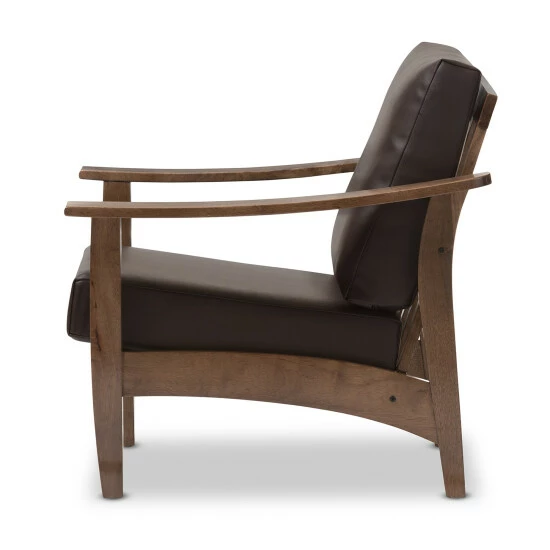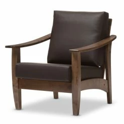 The look of your living room will be dramatically enhanced by Phanessa Mid-century Modern Walnut Wood and Dark Brown Faux Leather Livingroom 1-seater Lounge Chair. Wood is the best in style and class of any living room upholstery. Featuring mid-century retro modern design, the Phanessa accent chair is constructed of eco-friendly solid rubberwood, poplar and plywood board seat. A stylish and timeless piece of furniture collection, the Phanessa is finished in walnut wood.Β