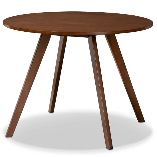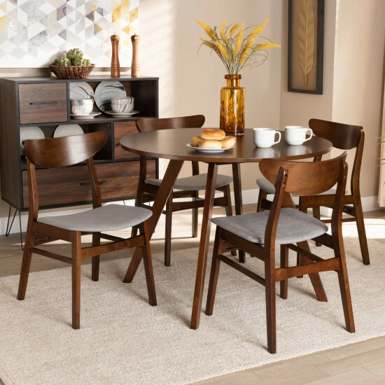 Efficient and comfortable design make the Philip dining set an easy addition to any dining space. Made in Malaysia, the Philip is constructed from durable wood and comfortably sits up to four. The walnut brown finished wood and round tabletop lend mid-century charm while providing abundant elbow room for each member of the table. Assembly is required and each chair is padded with foam underneath a layer of soft fabric for comfort. With its compact size, the Philip dining set is well suited for smaller nooks and dining spaces. .