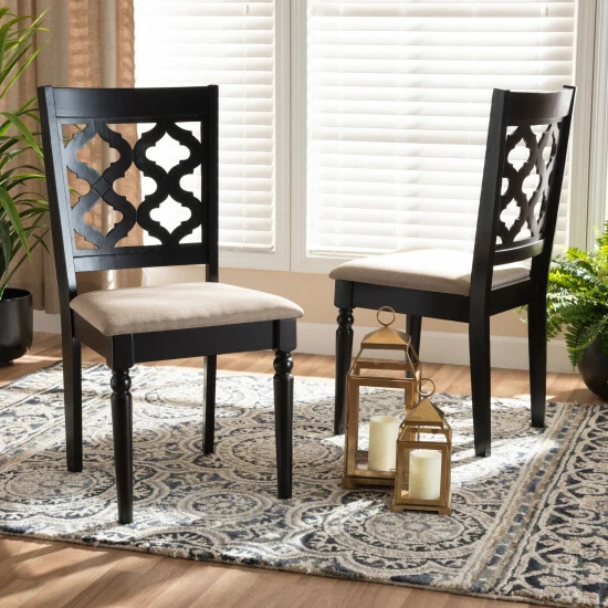 Outfit your dining room with the sophisticated design of the Ramiro dining chair. Made in Malaysia, the Ramiro is constructed from solid wood and showcases a warm walnut brown finish. A unique, symmetrical design on its back adds geometric intrigue to any space. The Ramiro requires assembly and is fitted with a foam padded seat upholstered in smooth fabric for superb comfort. Turned legs add a touch of classic style, distinguishing the Ramiro dining chair as an exquisite addition to any dining space…