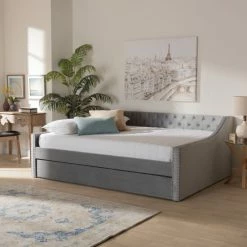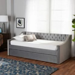 Grace your bedroom with the serene design of the Raphael daybed. Made in Malaysia, the Raphael is comprised of a sturdy wood frame padded with foam and upholstered in sumptuous velvet fabric. Its sloping arms are lined with silver finished metal nailheads for a dazzling touch of modern glamour, while the roll-out trundle provides convenient accommodation for overnight guests. Requiring assembly, the Raphael utilizes wood slats for mattress support, eliminating the need for a box spring. Chic button tufting lends a contemporary look from any angle, making the Raphael daybed a standout addition to the modern bedroom…