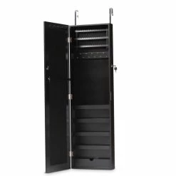 Discreetly arrange your jewelry all in one place with the elegant versatility of the Richelle jewelry armoire. Made in China, this armoire is constructed from sturdy wood. The door features a secure lock that opens to reveal necklace and bracelet hooks, three shelves, ring compression folds, earring holders, and one hanger rod. Requiring assembly, the Richelle can either be hung over the door, or mounted to the wall, to maximize floor space while providing convenient jewelry storage. A seamless and effective solution to your storage needs, the Richelle jewelry armoire gracefully organizes your collection…