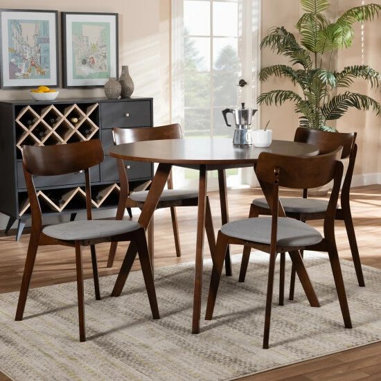 Comfortable and elegant, the Rika dining is designed for the modern home. Made in Malaysia, the Rika is constructed from durable wood and comfortably seats up to four. The walnut brown finished wood and round tabletop lend modern style while giving each member of the table plentiful elbow room. Assembly is required and each chair is padded with foam underneath a layer of soft fabric for comfort. With its compact size, the Rika dining set is well suited for smaller nooks and dining spaces…