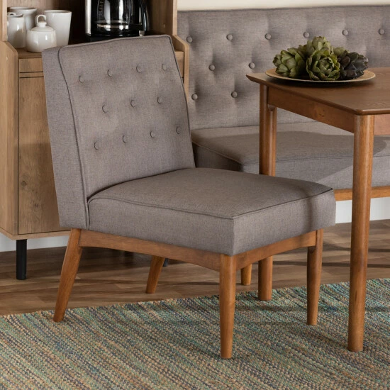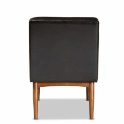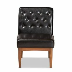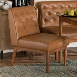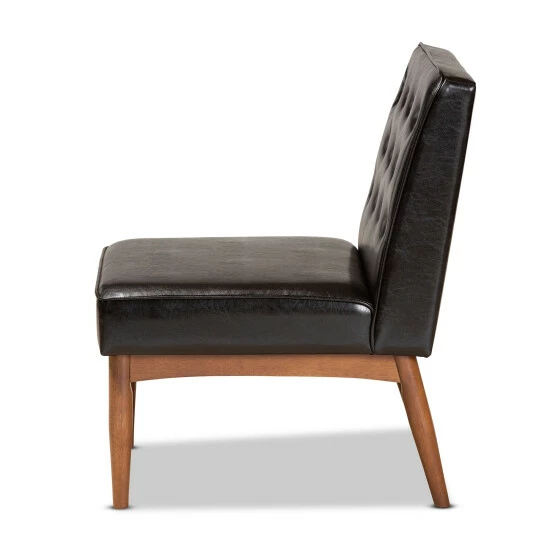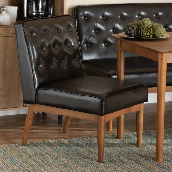 Enjoy the casual comfort and tasteful design of the Riordan dining chair. Made in Malaysia, the Riordan is constructed from walnut brown finished wood that radiates natural warmth. The chair is padded with plush foam and upholstered in smooth faux leather for superb comfort with a modern touch. Requiring assembly, the Riordan features elegant button tufting for rich texture and depth. Slim, tapered legs lend a touch of mid-century charm. Angled, tapered legs complete the look. Ideal for smaller dining rooms and nooks, the Sanford dining nook set rejuvenates any space.