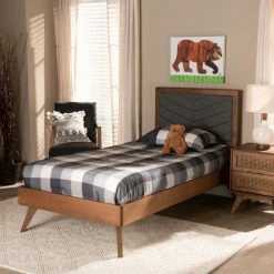 Coordinate your bedroom with the sleek symmetry of the Roze bed. Made in Malaysia, this bed is constructed from sturdy wood in a walnut brown finish that adds natural warmth to any space. Its chevron tufted headboard establishes an alluring, geometric backdrop, while plush foam padding provides pleasant comfort for you to lean against when sitting up in bed. Requiring assembly, the Roze utilizes wood slats for mattress support, which eliminate the need for a box spring. A simple yet striking addition, the Roze bed is an outstanding addition to any bedroom…